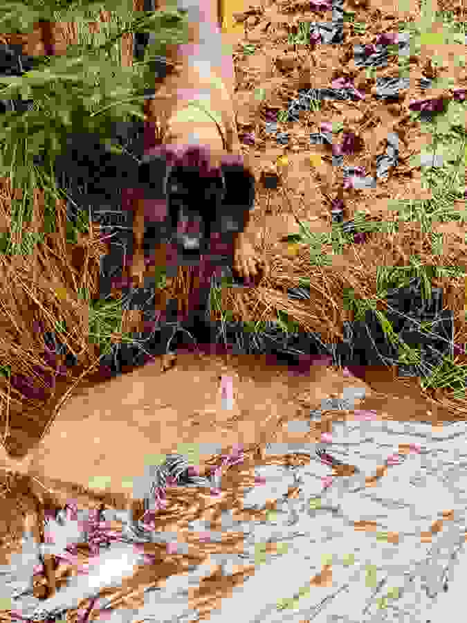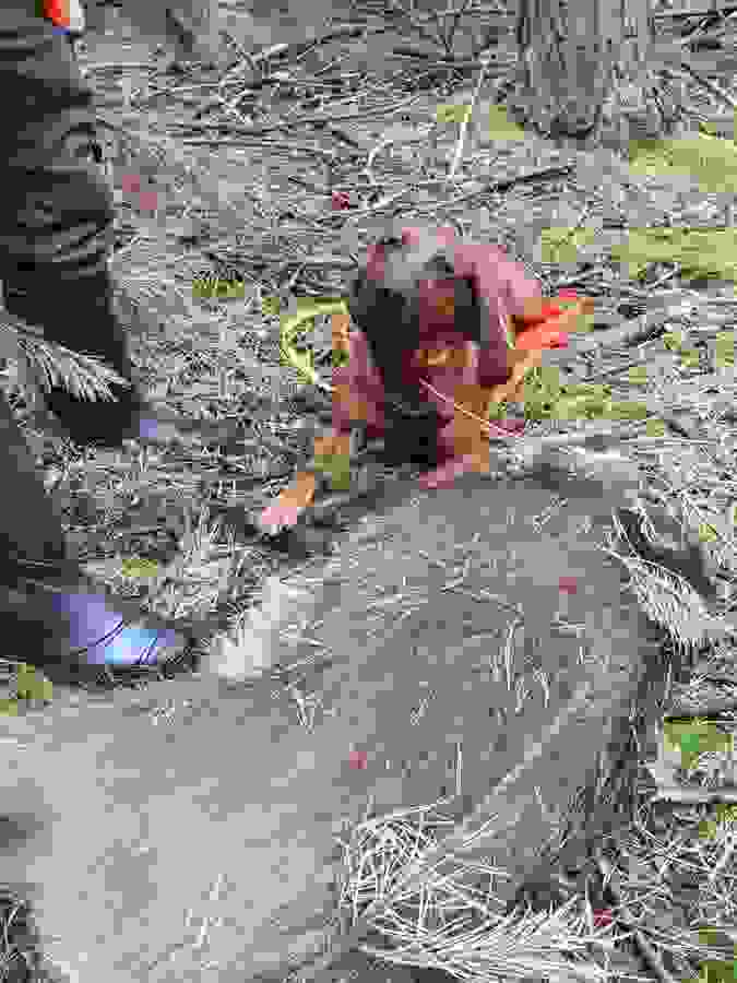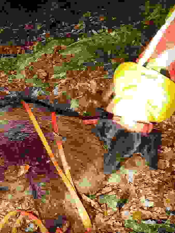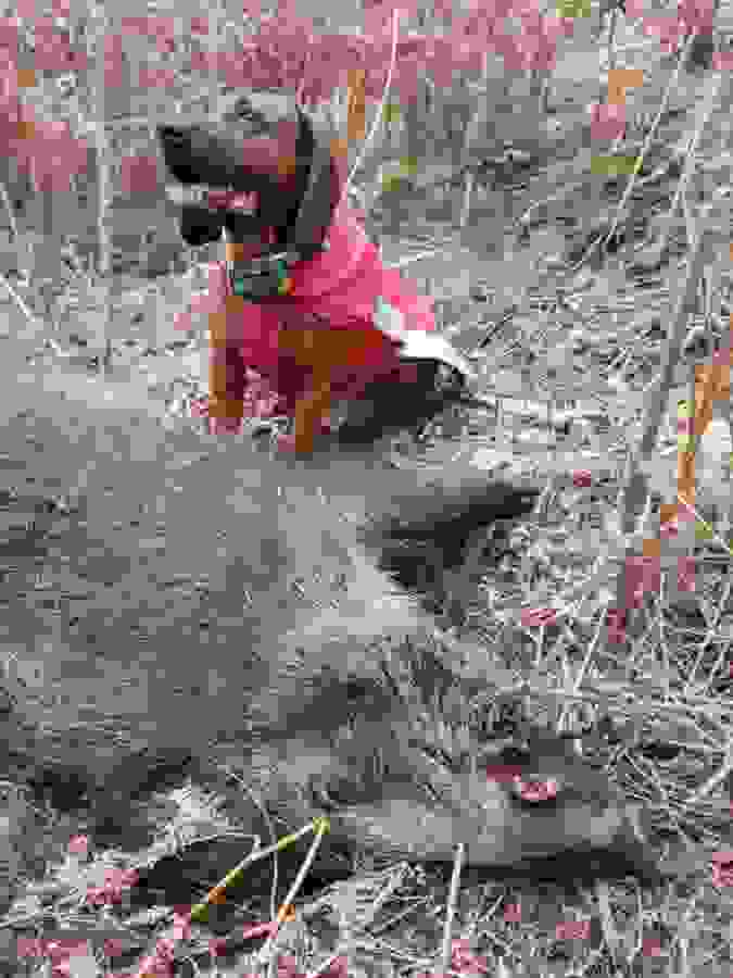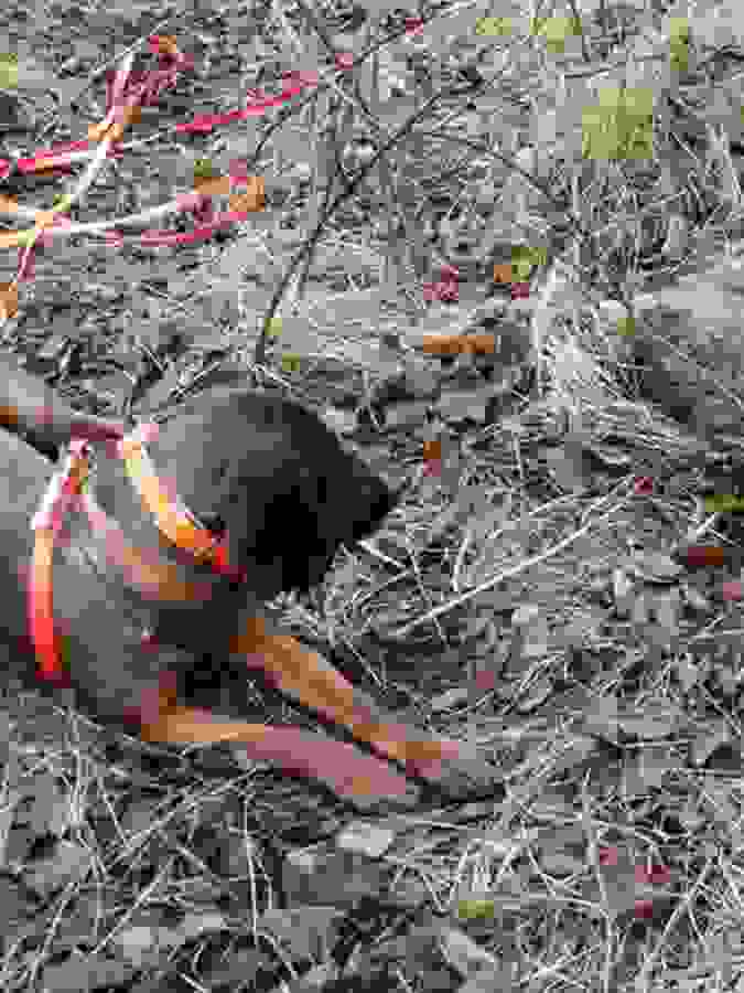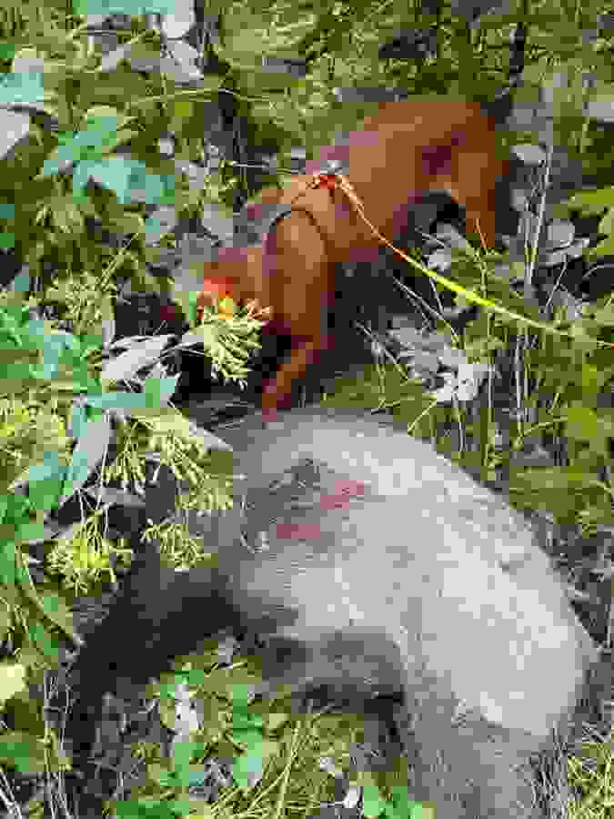 Ist der Ort des Geschehens relativ eindeutig lokalisierbar, sollte der Anschuß/die Unfallstelle auf Pirschzeichen (Schweiß, Schnitthaar, Knochen etc.) untersucht und deutlich markiert werden. Dies gibt unter Umständen wertvolle Hinweise zur Planung der Nachsuche. Dabei sollte möglichst ein "Vertreten der Fährte" vermieden werden. Ist der Anschuß/die Unfallstelle nicht sicher örtlich einzugrenzen, dann sollte ein "Herumtrampeln" vermieden werden. Unsere Hunde finden recht zuverlässig mittels Vorsuche auch kleinste Pirschzeichen.